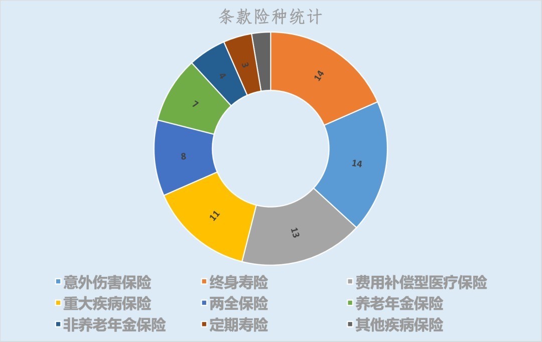 从产品类型来看,这76款产品涉及9大险种。其中意外伤害保险14款、终身寿险14款、费用补偿型医疗保险13款、重大疾病保险11款、两全保险8款、养老年金保险7款、非养老年金保险4款、定期寿险3款、其他疾病保险2款。