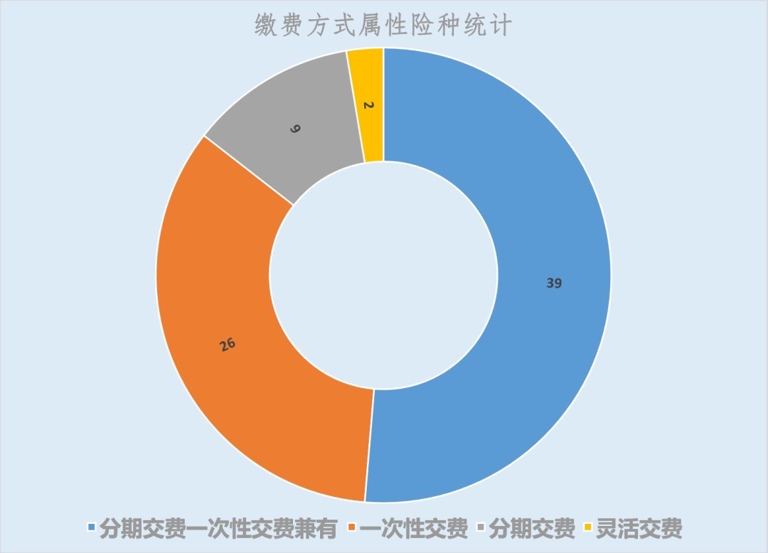 从缴费方式来看,这76款产品涉及4种交费方式。其中分期交费一次性交费兼有39款、分期交费9款、一次性交费26款、灵活缴费2款。